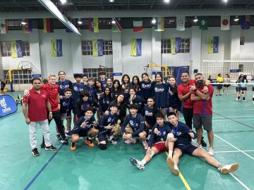AISG’S boys’ and girls’ varsity volleyball team pose with their coaches after a big game. (Image provided by G11 Dana)
