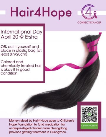 As some of you may know, the time of year to donate hair has come around again. Connect 4 Cancer will be hosting our hair donation event (Hair4Hope) during International Day (April 20) and it is time to start signing up! This year, Connect4Cancer will be donating the hair to a different organization, so there are fewer restrictions on hair conditions. In the past few years, colored and/or chemically treated hair was not allowed as it was believed that the hair would be bad quality. This year however, colored and chemically treated hair IS allowed, as long as it is in good condition. The other requirements remain the same — the hair must be at least 8 inches, or 20 centimeters, long and bleached hair is not allowed.