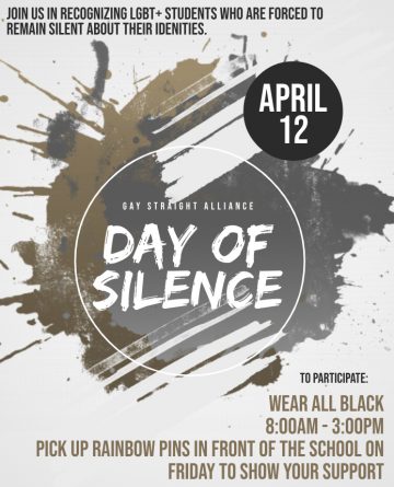 This year, on April 12, GSA (Gay-Straight Alliance) will be holding a Day of Silence. For the Day of Silence, students wear dark colors and take a vow of silence for a day in order to represent the LGBTQ+ students that are silenced.
